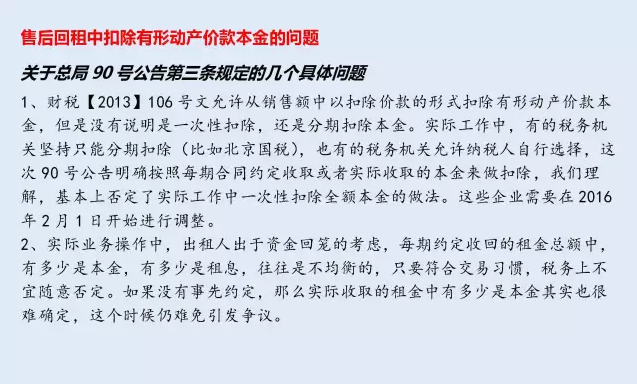 90號公告第三條規(guī)定,納稅人提供有形動產(chǎn)融資性售后回租服務(wù),計算當(dāng)期銷售額時可以扣除的有形動產(chǎn)價款本金,為書面合同約定的當(dāng)期應(yīng)當(dāng)收取的本金。無書面合同或者書面合同沒有約定的,為當(dāng)期實際收取的本金。