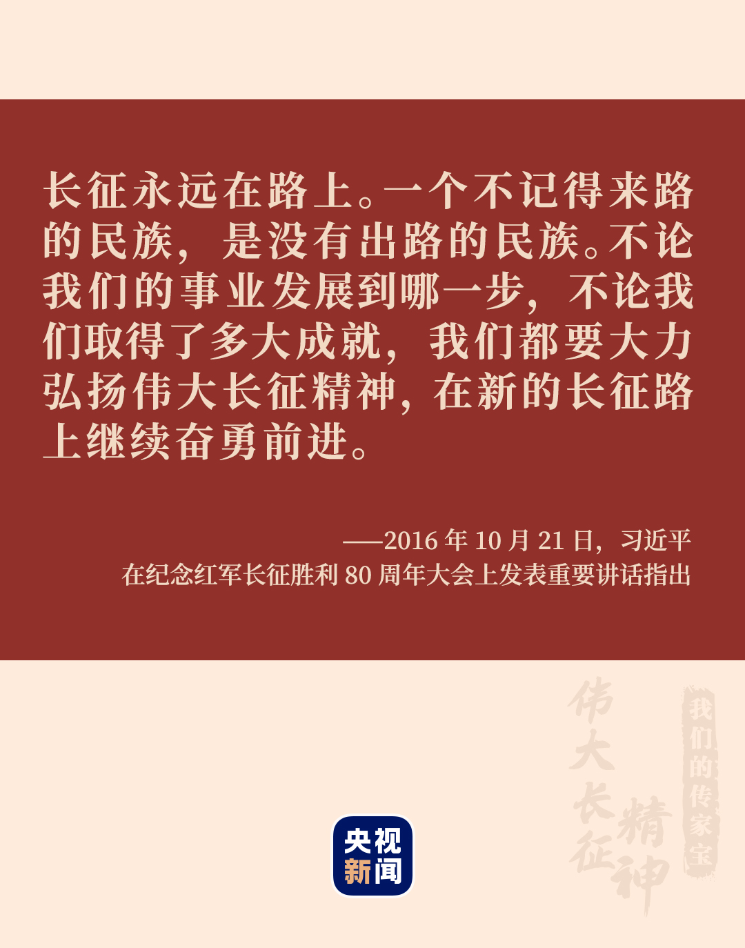 2016年10月,習(xí)近平總書記在紀(jì)念紅軍長征勝利80周年大會(huì)上指出,震撼世界、彪炳史冊的長征,宣告了國民黨反動(dòng)派消滅中國共產(chǎn)黨和紅軍的圖謀徹底失敗,宣告了中國共產(chǎn)黨和紅軍肩負(fù)著民族希望勝利實(shí)現(xiàn)了北上抗日的戰(zhàn)略轉(zhuǎn)移,實(shí)現(xiàn)了中國共產(chǎn)黨和中國革命事業(yè)從挫折走向勝利的偉大轉(zhuǎn)折,開啟了中國共產(chǎn)黨為實(shí)現(xiàn)民族獨(dú)立、人民解放而斗爭的新的偉大進(jìn)軍。