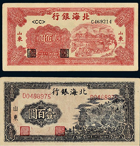 在抗戰(zhàn)勝利結束時,山東解放區(qū)已有極大發(fā)展,有12.5萬平方公里的面積,占山東總面積的92%,擁有2400萬人口,占山東總人口的90%。1948年10月,山東的北海銀行幣與華北的冀南銀行幣、晉察冀邊區(qū)幣固定比價互相流通,1948年11月16日起,北海銀行幣與華中銀行幣等價流通。這一時期的北海銀行幣均不加蓋地名,便于山東以外的地區(qū)流通。1948年12月1日,華北銀行、北海銀行、西北農民銀行合并,在石家莊成立中國人民銀行,但因工作的需要,北海銀行繼續(xù)營業(yè),1949年1月底開始回收北海銀行幣,同年11月1日改稱中國人民銀行山東分行,至此,北海銀行完成了它的歷史使命宣告結束。