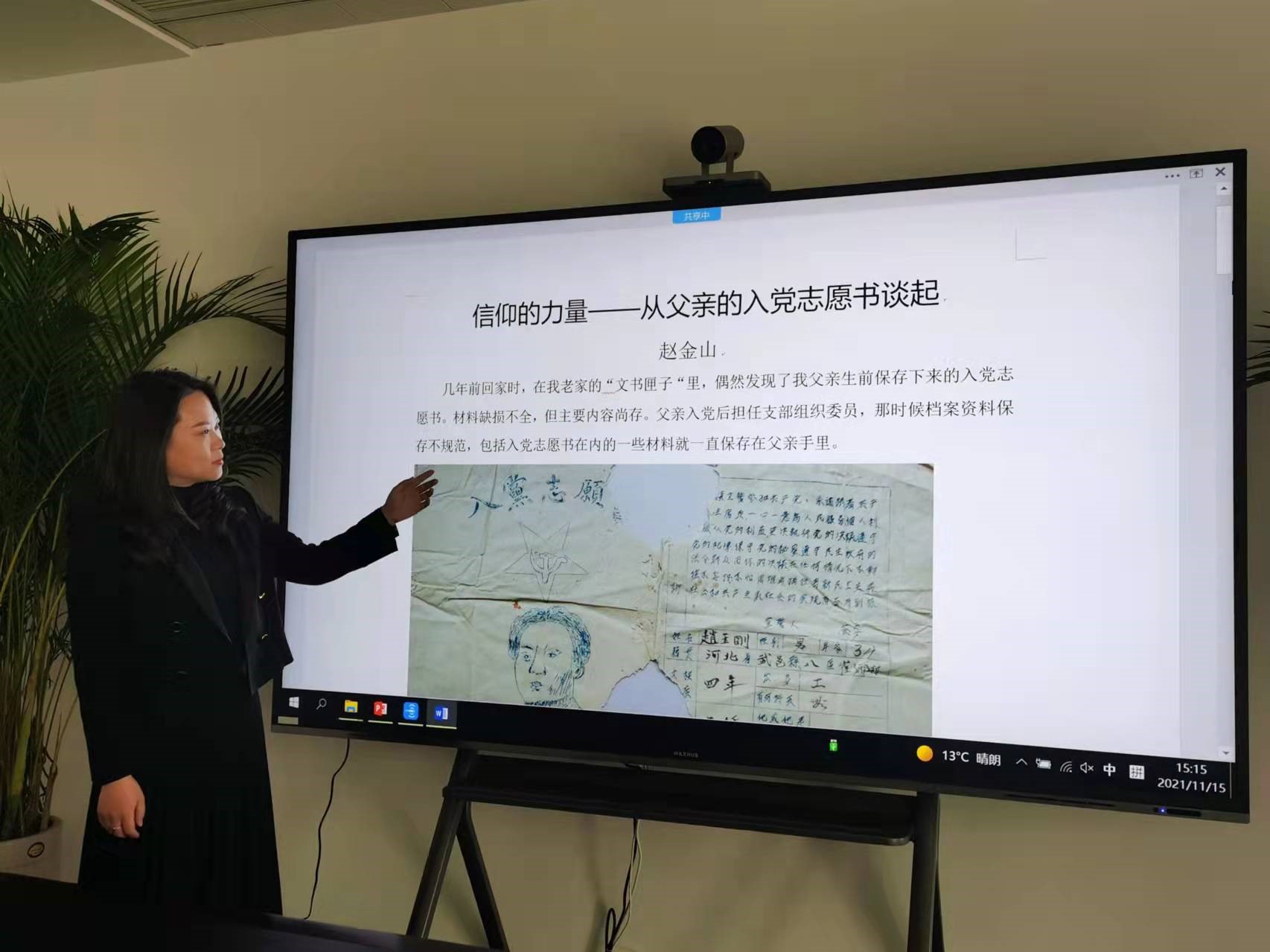 大家還研讀了趙金山同志的文章《信仰的力量——從父親的入黨志愿書談起》,在文中我們看到了趙金山同志的父親趙玉剛同志的《入黨志愿書》,這份《入黨志愿書》由中共冀南武邑縣委組織部印制,歷經(jīng) 60 多年歲月,雖已殘破,但圖案和字跡依然清晰,是非常寶貴的文獻(xiàn)資料。在了解了這份《入黨志愿書》的故事和趙玉剛同志的生平事跡后,大家被這種信仰堅(jiān)定、忘我奉獻(xiàn)、吃苦在前、享受在后的精神所打動,表示一定要繼承老一輩共產(chǎn)黨員的光榮傳統(tǒng),在公司戰(zhàn)略轉(zhuǎn)型的關(guān)鍵時期勇挑重?fù)?dān),踐行使命-----這是我們每個共產(chǎn)黨員的責(zé)任。